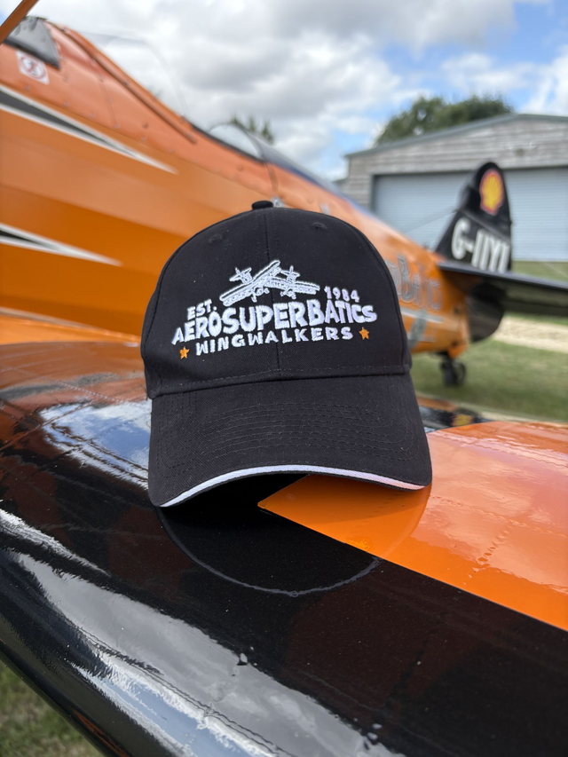 Our AeroSuperBatics black caps were made to celebrate our 40th anniversary wingwalking. One size fits all, adjustable at the rear.